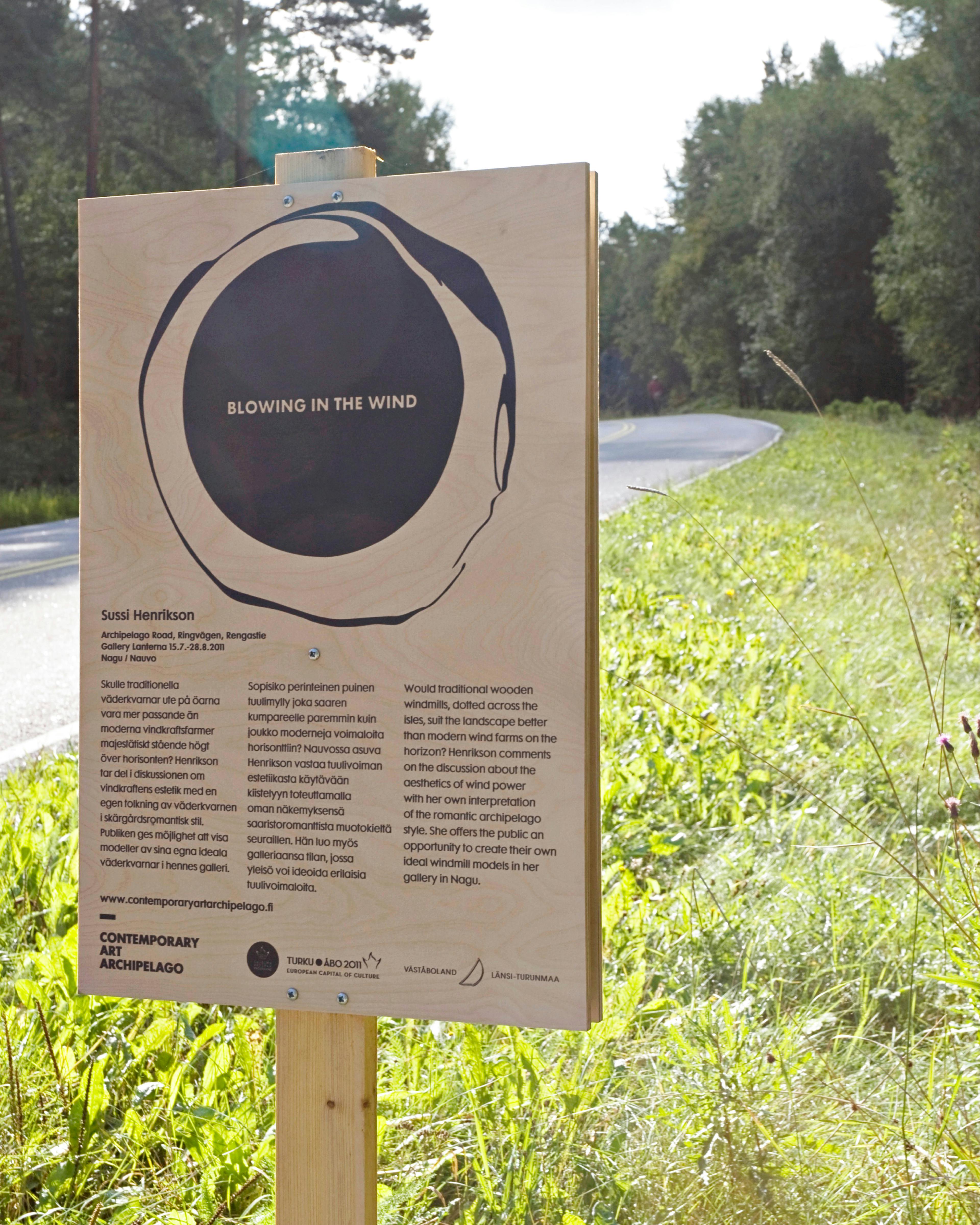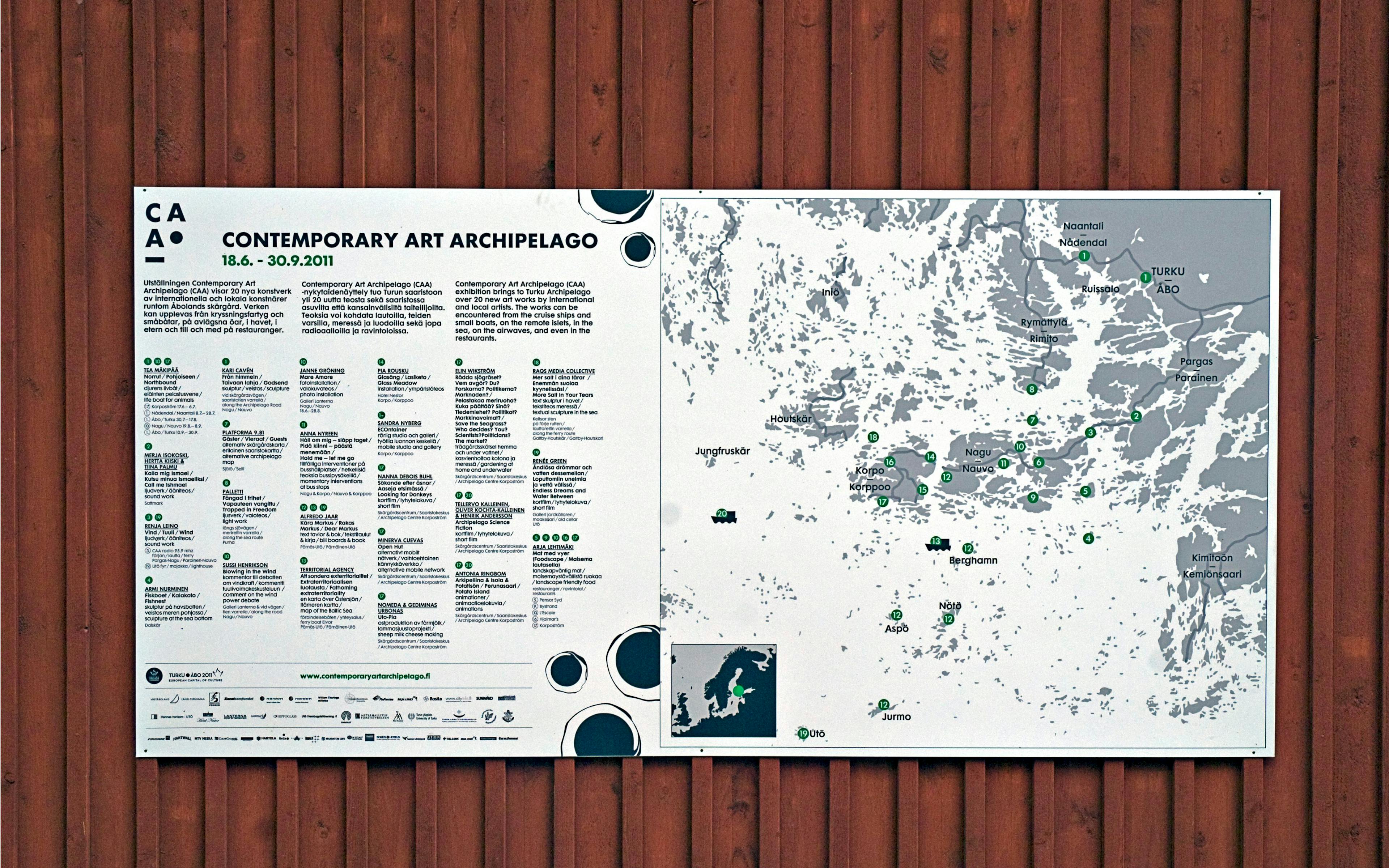 The Contemporary Art Archipelago exhibition consisted of more than 20 new site-specific art works and events realised in the Turku archipelago in Finland by international and local artists. The exhibition was staged across the isles and visitors encountered it from cruise ships and small boats, along roads, on a remote islet, in the sea, on the airwaves, on the ferries or even on their plates in local restaurants.