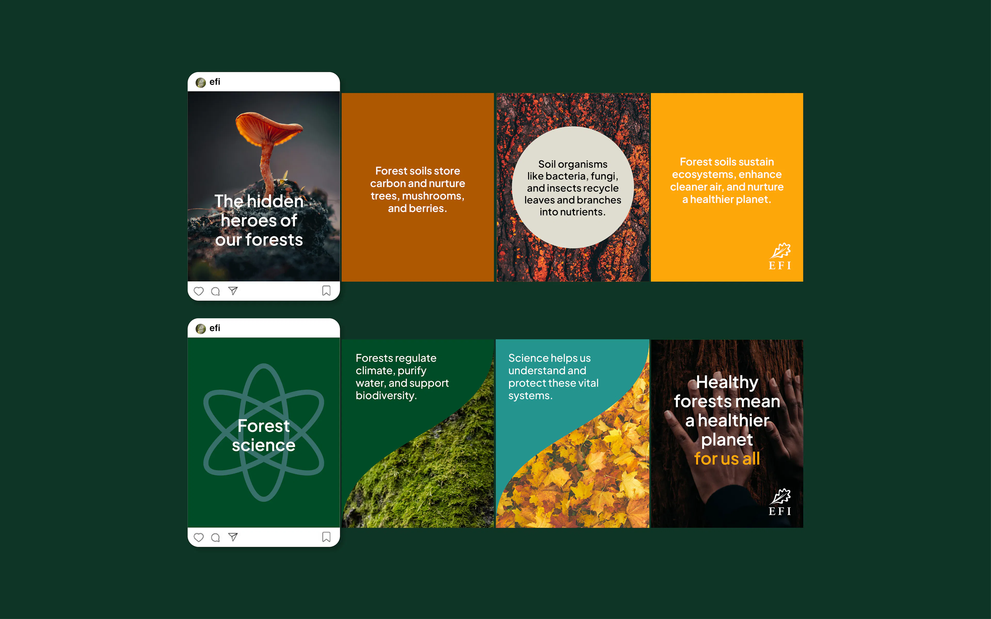 That approach also helped answer the practical needs in the brief. EFI wanted something timeless, flexible and adaptable across future channels, with more consistency, a complementary colour system, and less reliance on stock imagery. The result was a visual language where every curve of the leaf could keep working hard – shaping a sustainable future while giving the organisation more room to speak with clarity, coherence and innovation.