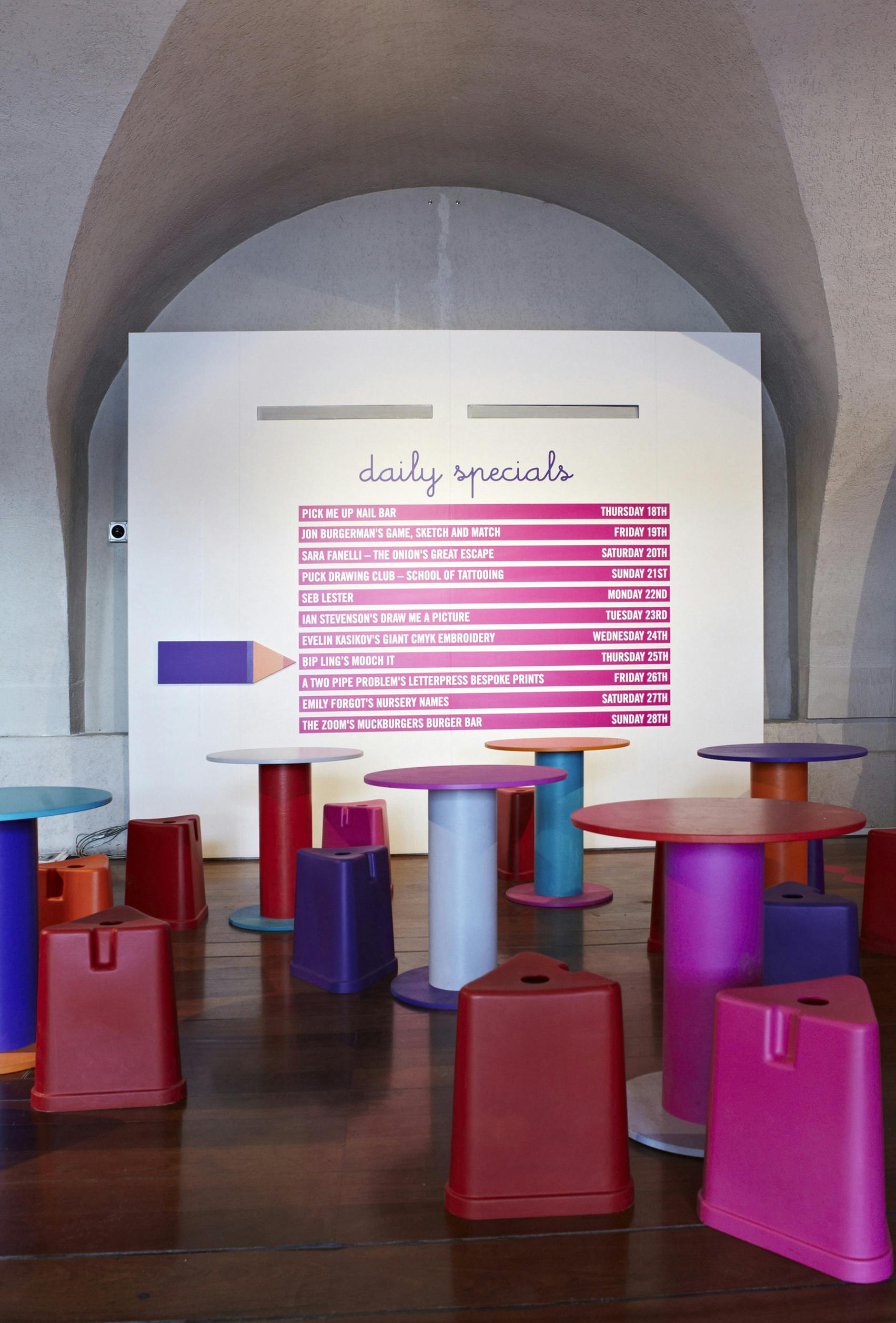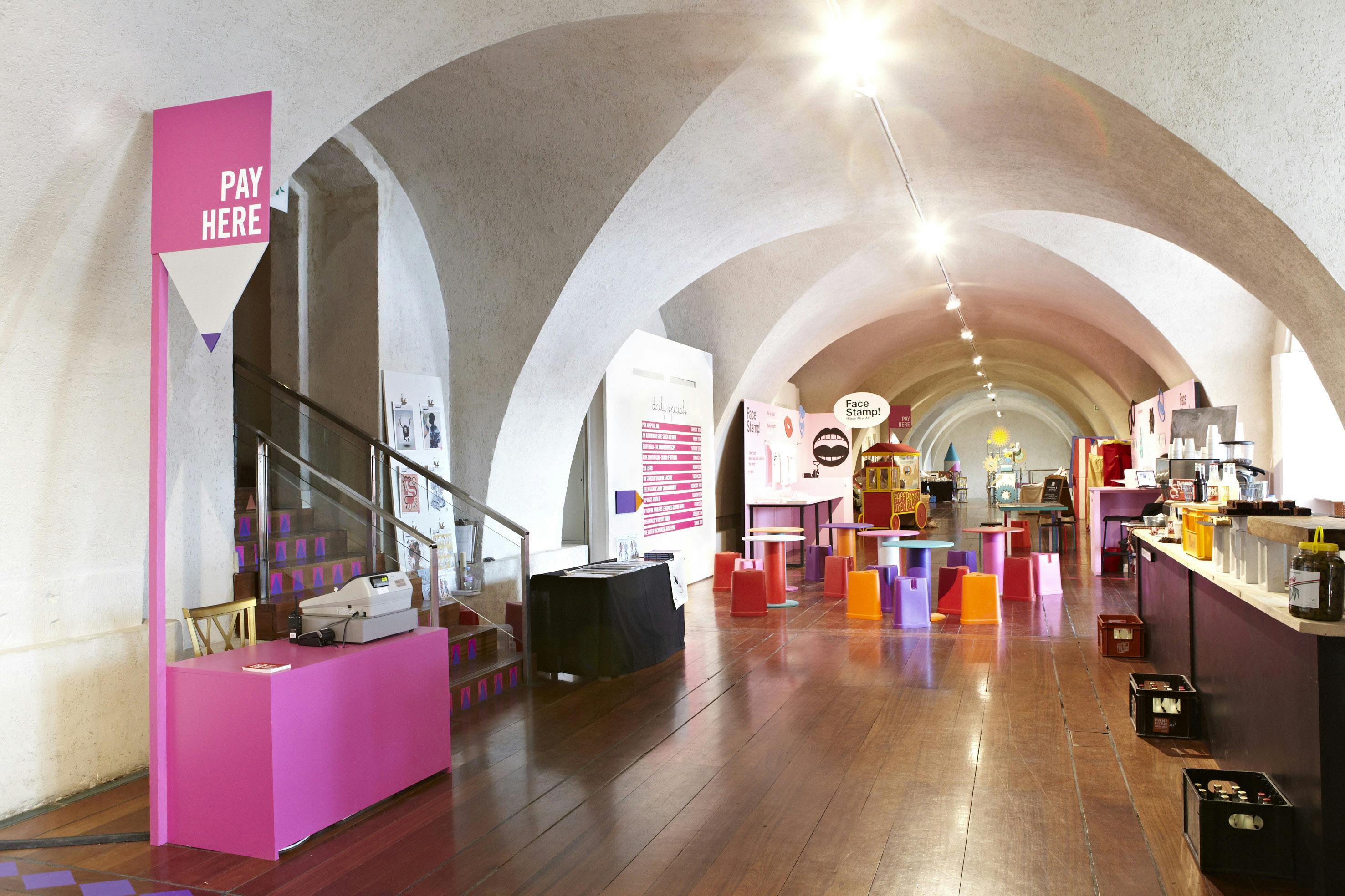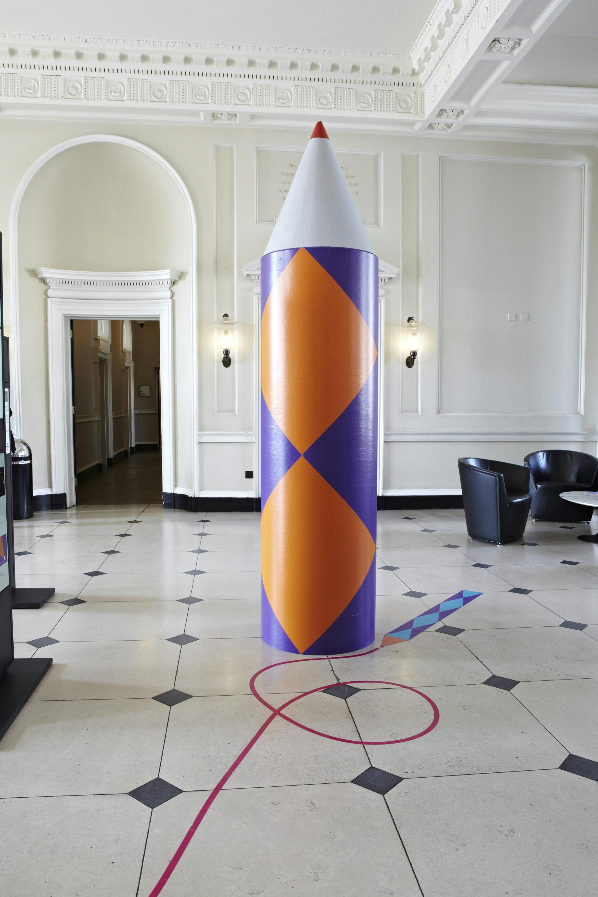 With such a large event located in multiple levels, visitors needed pointing in the right direction. A giant 3D pencil device worked as a directional element, picking up on the ‘graphic’ arts theme. The identity also featured a diamond pattern, which evolved from the point at the end of the pencil to give the graphics a directional quality.