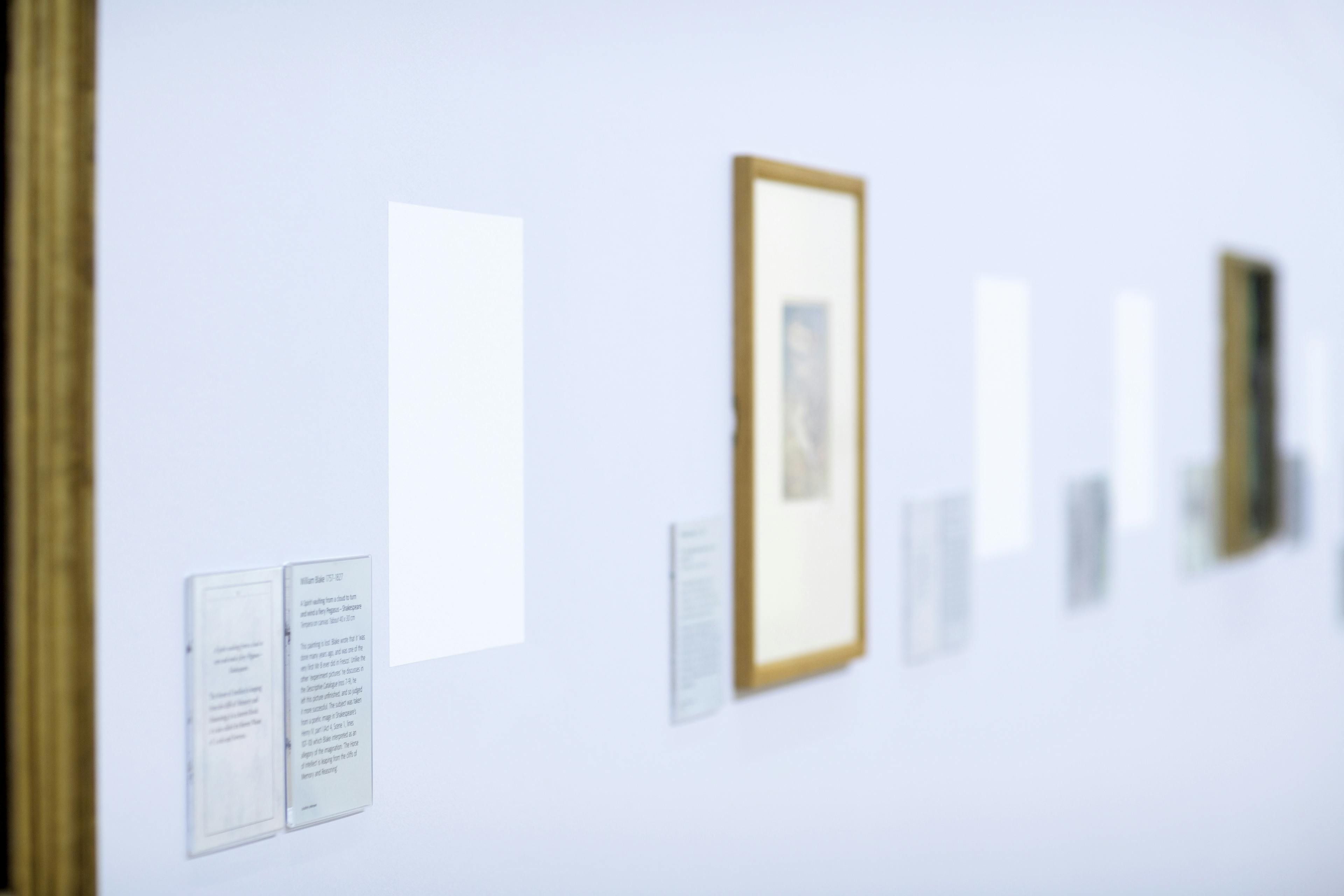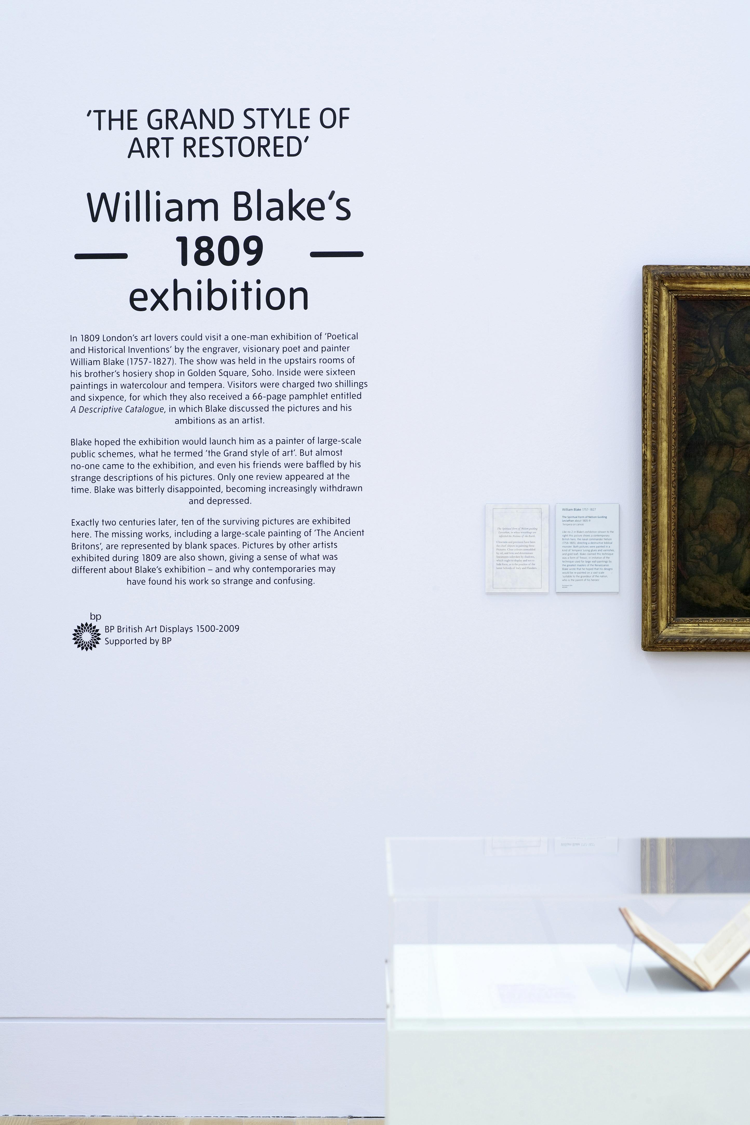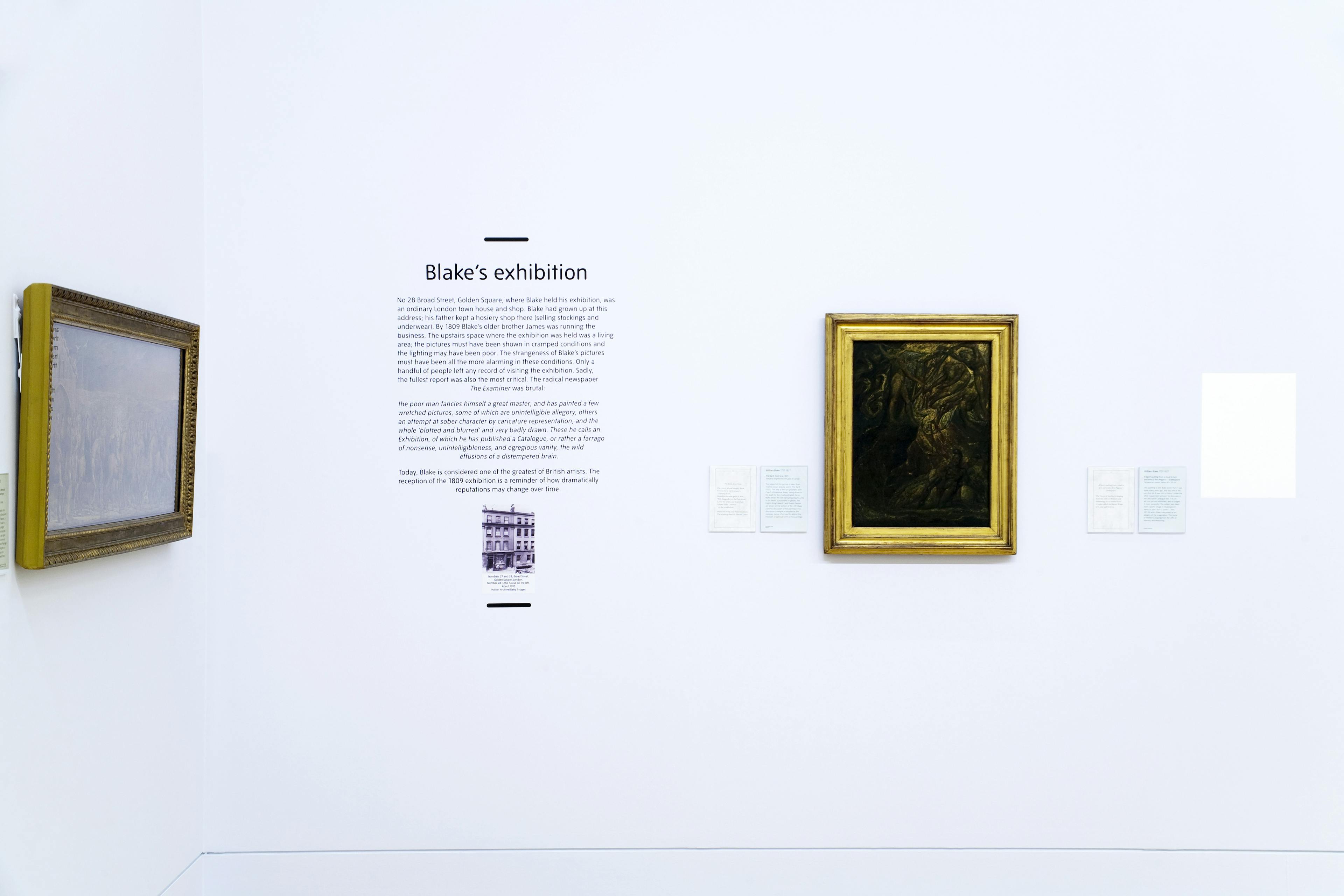 I designed the exhibition graphics, with the missing five works, including a large-scale painting of The Ancient Britons, represented by blank spaces. Pictures by other artists exhibited during 1809 are also shown, giving a sense of what was different about Blake's exhibition – and why contemporaries may have found his work so strange and confusing.