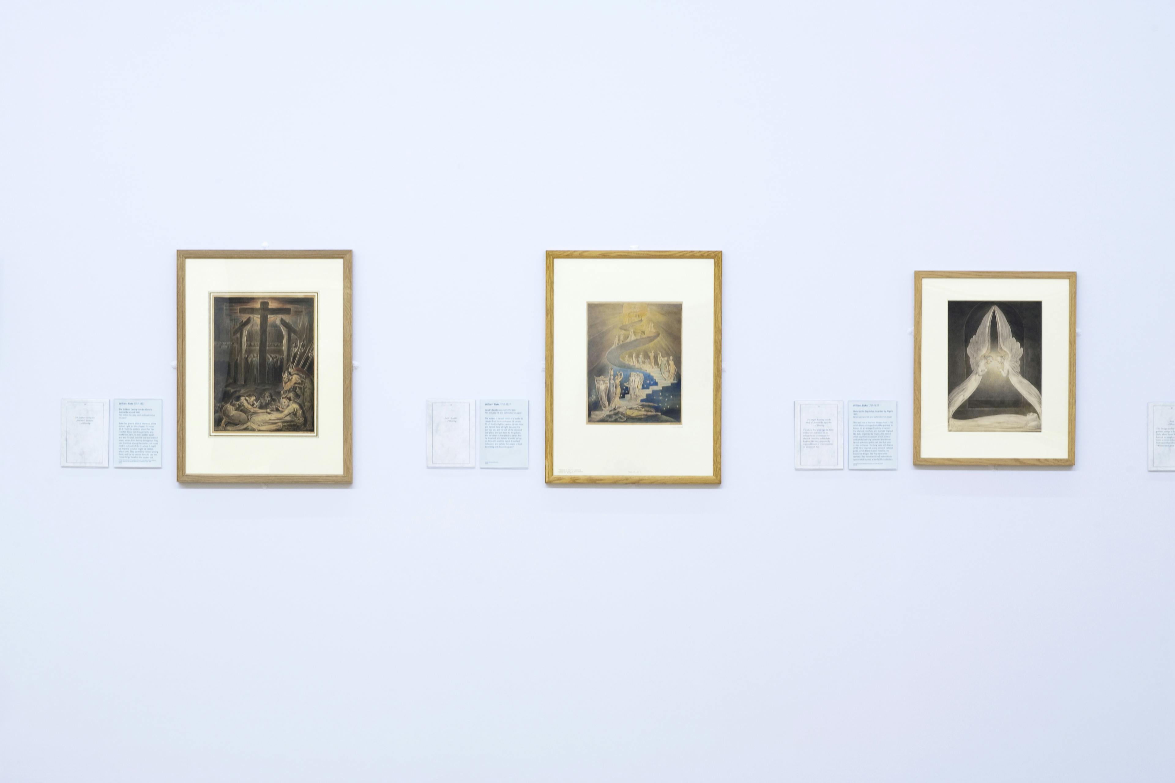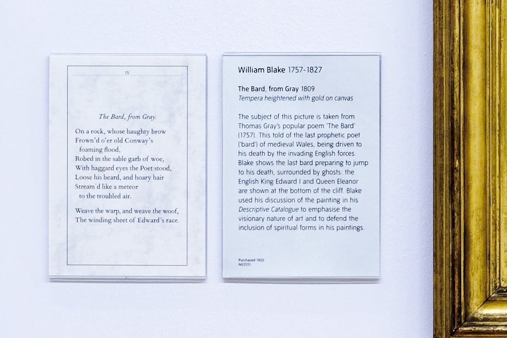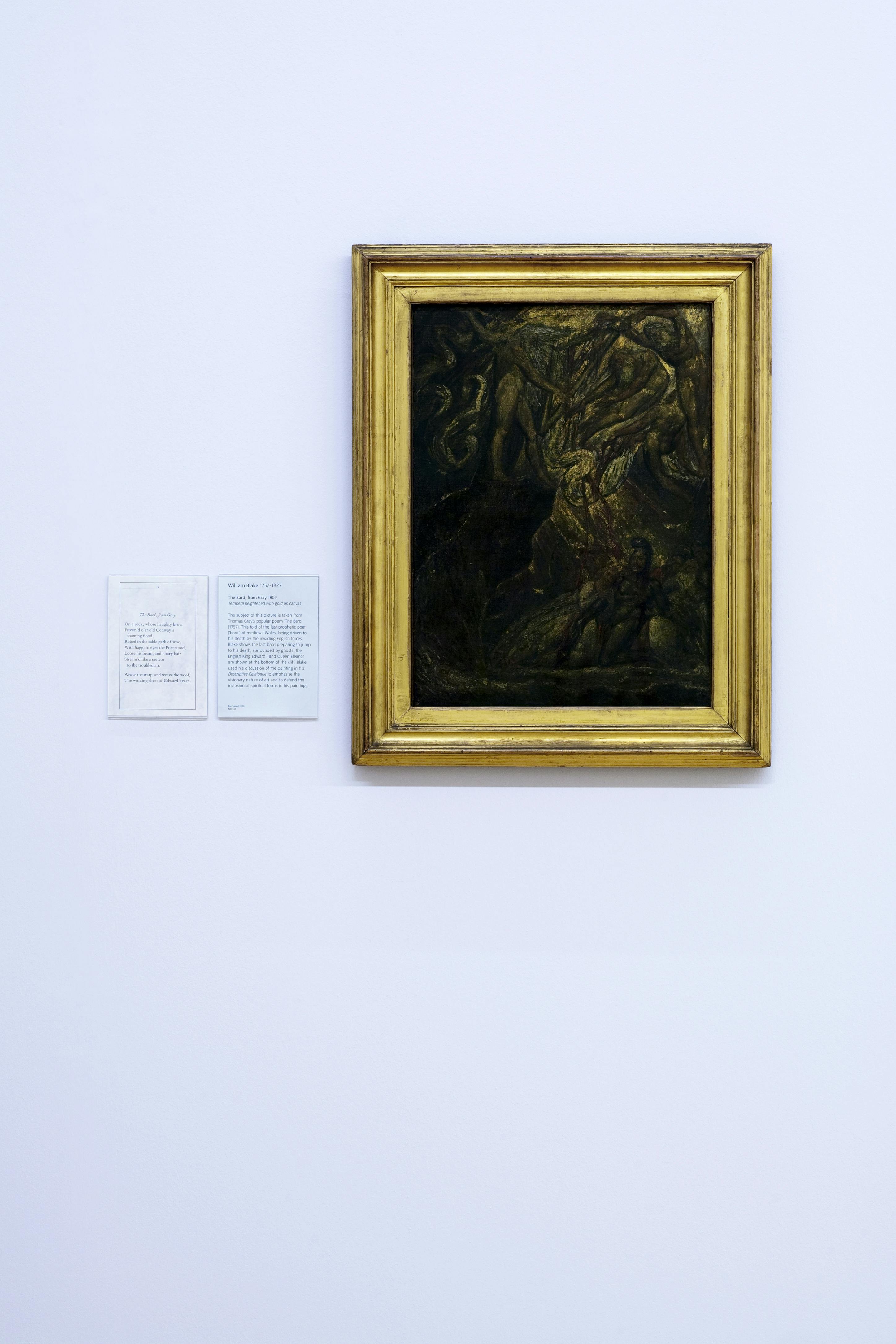 I designed the exhibition graphics, with the missing five works, including a large-scale painting of The Ancient Britons, represented by blank spaces. Pictures by other artists exhibited during 1809 are also shown, giving a sense of what was different about Blake's exhibition – and why contemporaries may have found his work so strange and confusing.